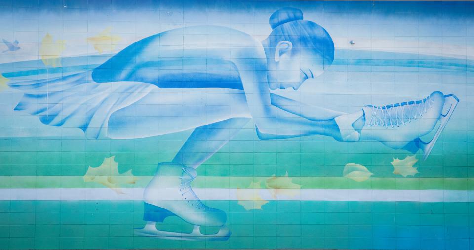 As reflected in the design, this artwork is installed on the side of the arena that hosts skating and hockey events. The scene includes rolling Cariboo Mountains, a paddle wheel, and yellow leaves that highlight the area’s natural landscape and local character. A hockey player sculpted from metal brings dimension to the piece. The artwork also complements a similar mural located across the way on the curling rink, creating a visual connection between the two buildings.